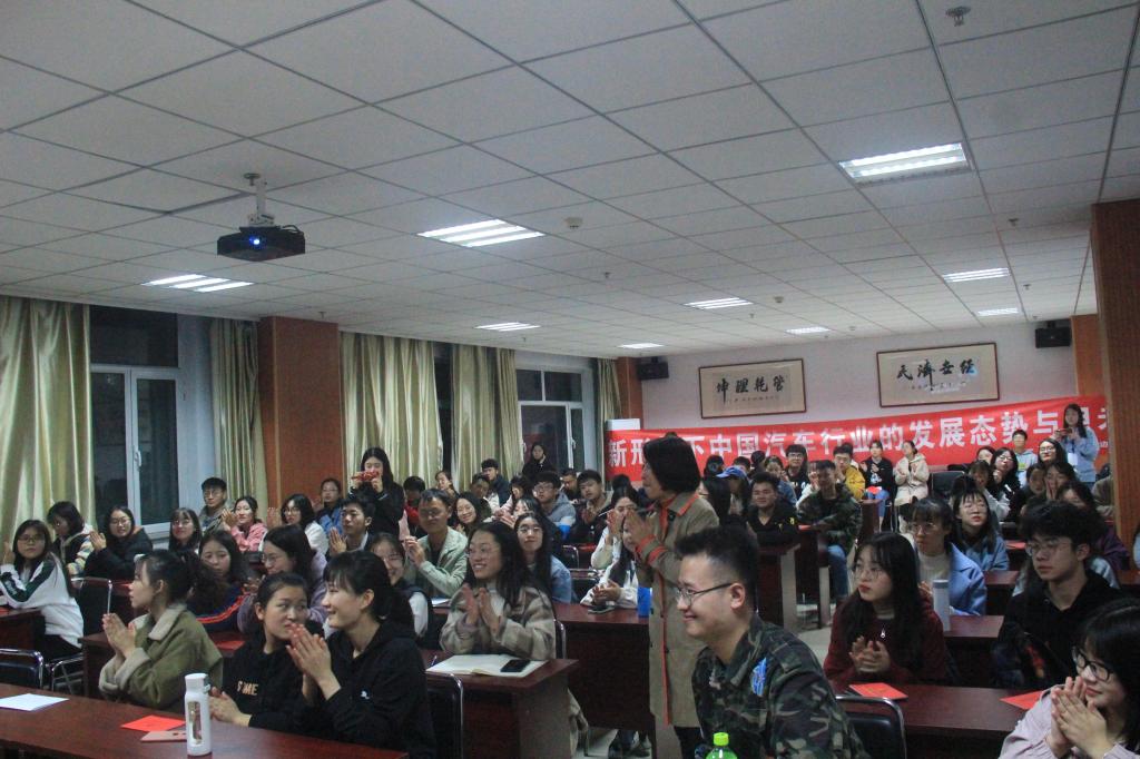 胡边疆先生首先抛出“高速增长,车市下行,新四化,出行服务商”四个关于中国汽车市场的关键词,并对其详细解释,随后他谈到中美贸易战争对中国汽车市场的影响以及新能源汽车的发展历程。我院学子从中认识到为保护环境,共建绿色家园,中央高度重视新能源的开发,新能源汽车也迎来大好前景。最后先生为我院学子介绍了中国汽车市场的现状,并对新能源汽车的发展给予高度肯定。