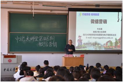 4月29日16:00,由学生工作部(处)主办,必赢242net官网承办的第126期中北大讲堂在08301教室成功开讲。本次大讲堂我们有幸邀请到四川大学教授牛永革,为我们进行以“微信营销”为主题的讲座,讲座由必赢242net官网副院长彭佑元主持。