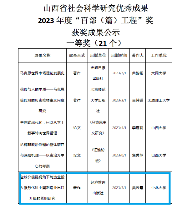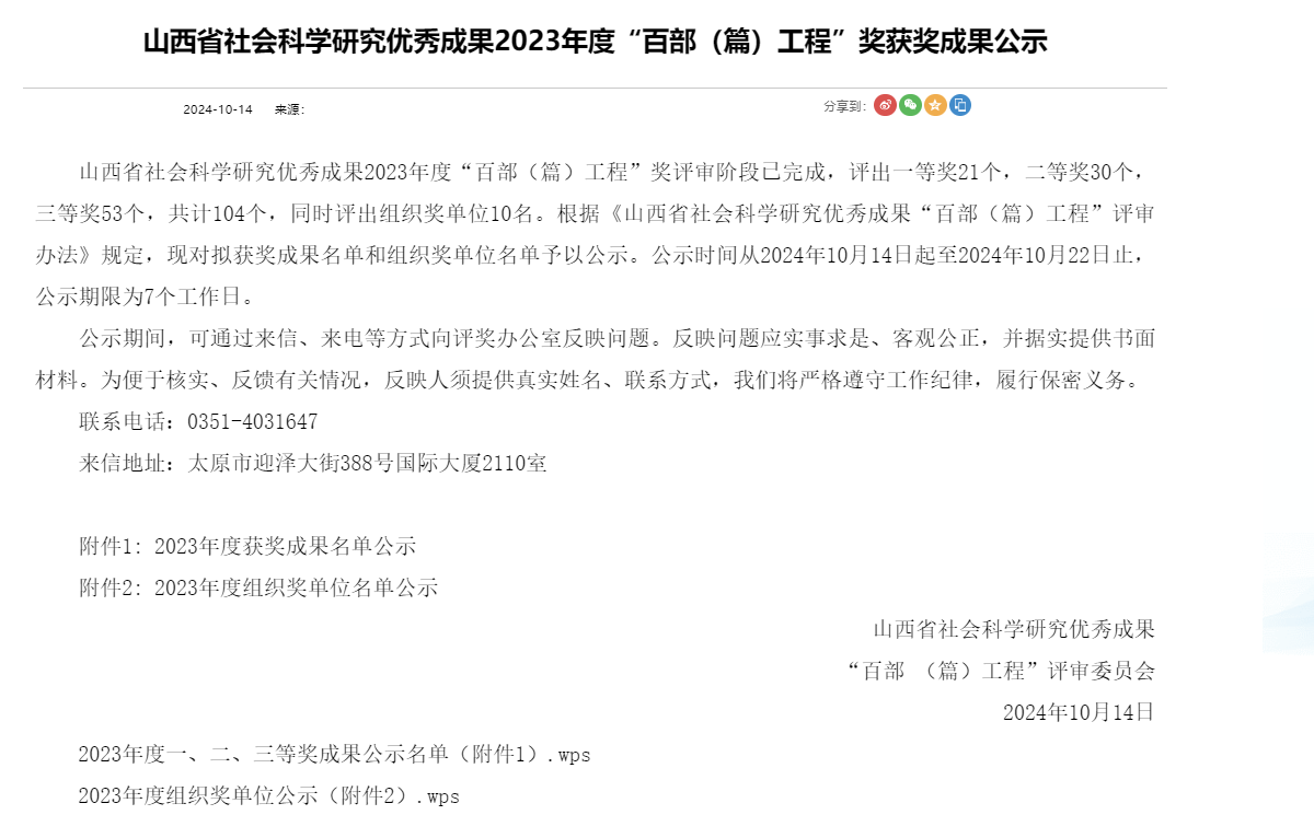 山西省社会科学研究优秀成果“百部(篇)工程”是由山西省社会科学界联合会组织的全省性社会科学研究优秀成果评奖工作,是对省内优秀科研工作的嘉奖。我院两位老师获奖,展示了我院教师扎实的科研基础和科研能力。未来我院将继续积极为青年教师搭建平台,提供良好科研环境,助力青年教师发展。