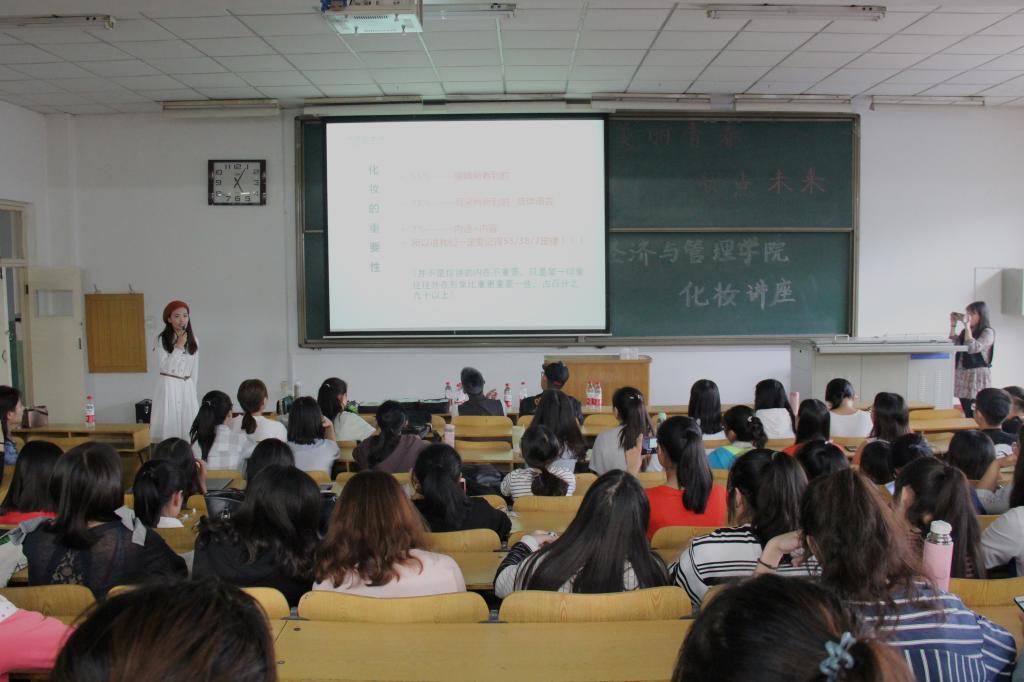9月26日下午5点,由必赢242net官网举办的“美丽青春,妆点未来”化妆讲座在08302H教室开展。本次讲座特别邀请小乐造型时尚集团高级化妆讲师要文君老师和高级美发讲师蒋龙老师来我院讲授如何打造专业的职场造型。即将走向职场的大四同学参加讲座。